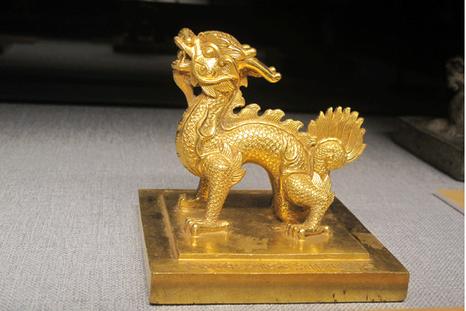 Tượng rồng trên ấn "Đại Nam hiệp kỷ lịch chi bảo", chất liệu vàng, thời Nguyễn , thuộc bộ sưu tập của