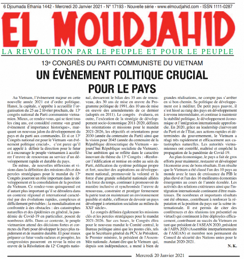 Báo El Moudjahid (báo Cựu Chiến binh, một tờ báo chính thống lớn và uy tín nhất của Algeria) có 2 bài viết với các chủ đề: "Đại hội Đảng Cộng sản Việt Nam lần thứ XIII: Vì thời kỳ phát triển mới của đất nước" và "Đại hội Đảng Cộng sản Việt Nam lần thứ XIII". Cả 2 bài viết đều khẳng định rằng với chủ đề "Khát vọng, Phát triển, Đổi mới, Sáng tạo", đây là "sự kiện trọng đại có tầm quan trọng mang tính lịch sử", đánh dấu một mốc son mới trong sự phát triển của Việt Nam, cũng như của Đảng Cộng sản Việt Nam.