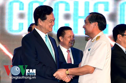 | Thủ tướng Nguyễn Tấn Dũng chúc mừng Tổng cụ Hải quan đã thực hiện tốt cơ chế Một cửa quốc gia (Ảnh: Nhật Bắc) |