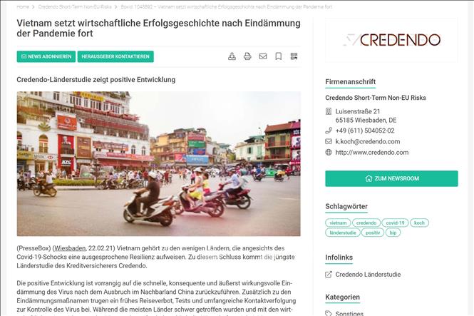 Ngày 22/2, chi nhánh Tập đoàn bảo hiểm tín dụng châu Âu Credendo tại Đức và Áo công bố nghiên cứu đánh giá mức độ rủi ro ở Việt Nam, trong đó nhấn mạnh quốc gia Đông Nam Á đang viết tiếp câu chuyện thành công về kinh tế sau khi kiểm soát tốt dịch COVID-19.