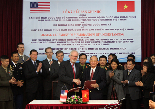 (VOV5) - Lễ ký kết Bản ghi nhớ giữa Ban chỉ đạo Nhà nước về Chương trình hành động quốc gia khắc phục hậu quả bom mìn sau chiến tranh nước CHXHCN Việt Nam và Bộ Ngoại giao Hoa Kỳ về hợp tác khắc phục hậu quả bom mìn sau chiến tranh tại Việt Nam diễn ra sáng nay, 16/12, tại Hà Nội.