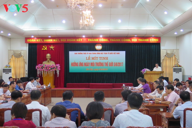 Sáng 30/5, tại Hà Nội, Uỷ ban Trung ương Mặt trận Tổ quốc Việt Nam tổ chức mít tinh hưởng ứng ngày Môi trường thế giới 5/6/2017. Chủ đề ngày môi trường thế giới năm nay là “Sống hài hòa với thiên nhiên” nhằm kêu gọi, khuyến khích cộng đồng gắn bó hữu cơ với thiên nhiên, từ đó cảm nhận vẻ đẹp cũng như tầm quan trọng của nó đối với cuộc sống, đồng thời chia sẻ, tiếp nối lời kêu gọi bảo vệ trái đất, bảo vệ mối quan hệ hài hòa và bền vững giữa con người và thiên nhiên.