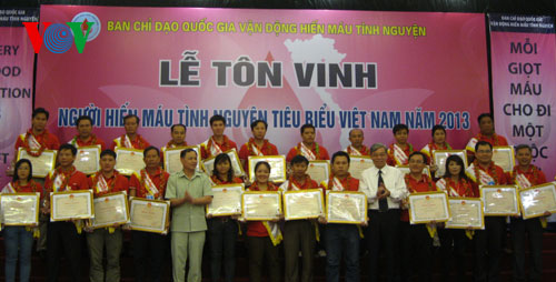 (VOV5)- Lễ tôn vinh 100 người hiến máu tình nguyện tiêu biểu Việt Nam năm 2013 được tổ chức trọng thể chiều nay, tại Hà Nội. Đây là hoạt động hưởng ứng ngày thế giới tôn vinh những người hiến máu tình nguyện, do Ban Chỉ đạo quốc gia vận động hiến máu tình nguyện tổ chức.
