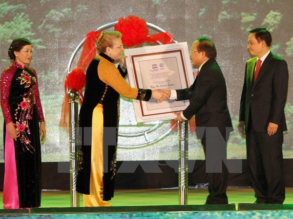 | Lễ đón Bằng của UNESCO ghi danh quần thể danh thắng Tràng An là di sản văn hóa và thiên nhiên thế giới hồi tháng 1/2015. (Ảnh: Quốc Khánh/TTXVN) |
