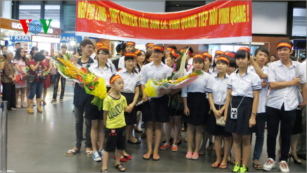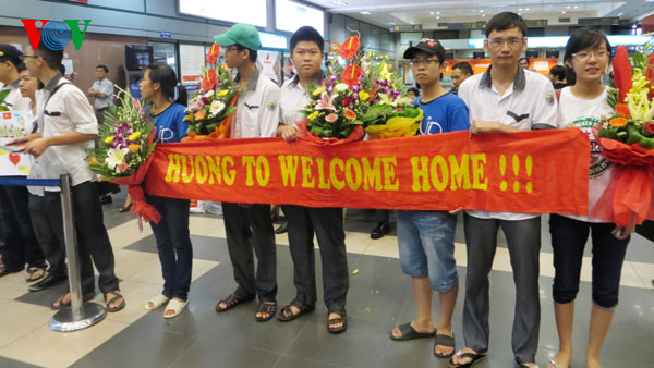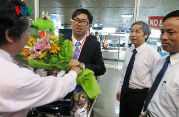 (VOV5) - Đúng 6h sáng nay (16/7), đội tuyển học sinh (HS) Việt Nam tham dự Olympic Vật lý quốc tế năm 2013 có mặt tại sân bay Nội Bài sau khi tham dự kỳ thi từ Đan Mạch trở về.