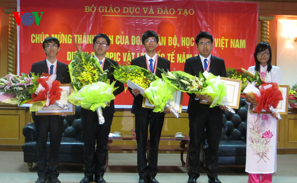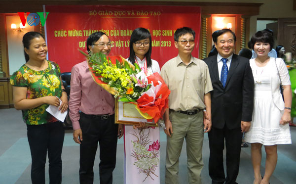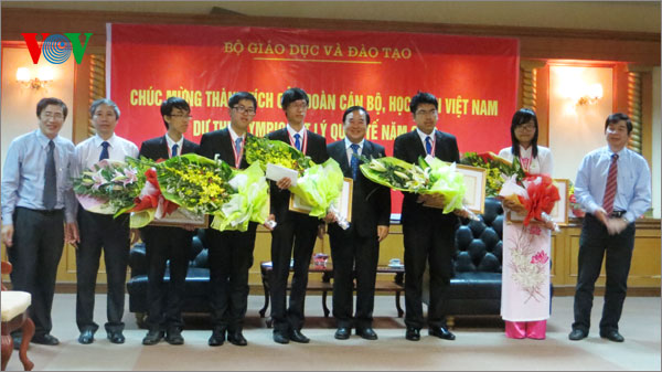 | Thứ trưởng Bộ GD-ĐT Trần Quang Quý (thứ 4 từ phải qua) trao Bằng khen cho 5 học sinh đoạt giải trong kỳ thi Olympic Vật lý Quốc tế năm 2013 |