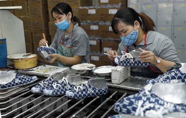 Sản xuất giày xuất khẩu tại Công ty Trách nhiệm hữu hạn Hóa dệt Hà Tây - Ảnh: Trần Việt/TTXVN |