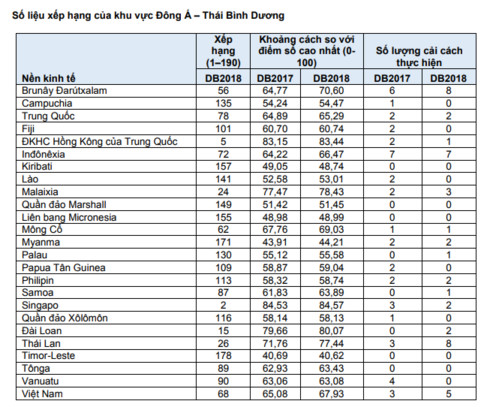 Đây là xếp hạng theo báo cáo Doing Business 2018 (báo cáo thường niên về Môi trường kinh doanh của Ngân hàng Thế giới (WB) công bố mới đây. Trong 10 tiêu chí đánh giá xếp hạng của WB, nộp thuế và tiếp cận điện năng là hai tiêu chí có nhiều cải cách nhất.