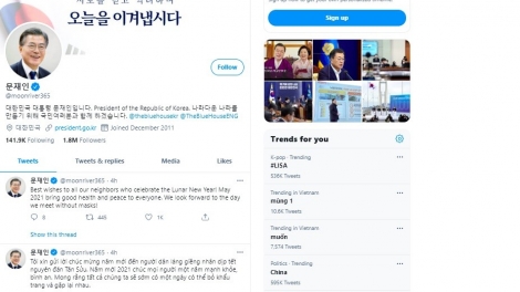 (VOV5) - Nhà lãnh đạo Hàn Quốc đã gửi lời chúc Tết nguyên đán bằng cả tiếng Hàn, tiếng Việt, tiếng Trung và tiếng Anh.
