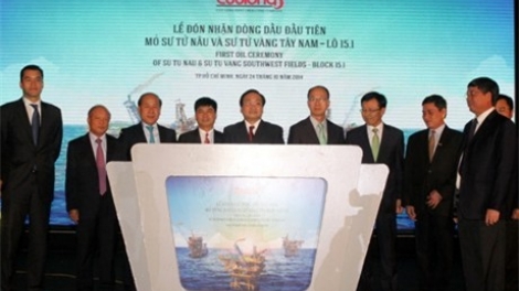 (VOV5) - Phó Thủ tướng Hoàng Trung Hải và các đại biểu nhấn nút đón nhận dòng dầu đầu tiên mỏ Sư Tử Nâu và khu vực mở rộng mỏ Sư Tử Vàng.