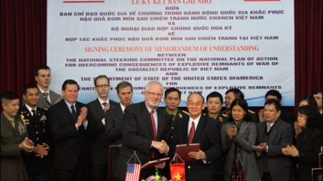 (VOV5) - Lễ ký kết Bản ghi nhớ giữa Ban chỉ đạo Nhà nước về Chương trình hành động quốc gia khắc phục hậu quả bom mìn sau chiến tranh nước CHXHCN Việt Nam và Bộ Ngoại giao Hoa Kỳ về hợp tác khắc phục hậu quả bom mìn sau chiến tranh tại Việt Nam diễn ra sáng nay, 16/12, tại Hà Nội.