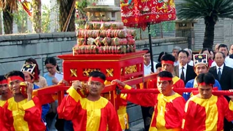 (VOV5) - Sáng 06/02, thành phố Hồ Chí Minh tổ chức lễ dâng cúng bánh tét quốc tổ Hùng Vương. Tại buổi lễ, các đại biểu cùng hàng ngàn người dân thành phố đã thắp hương và dâng lên Quốc tổ 18 đời Vua Hùng những đặc sản của vùng đất Nam bộ như bánh tét truyền thống, trầu cau Bà Điểm, rượu Gò Đen.