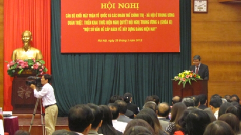 (VOV) - Sáng 28/3 tại Hà Nội, Ban Dân vận Trung ương tổ chức Hội nghị cán bộ chủ chốt khối Mặt trận Tổ quốc và các đoàn thể chính trị - xã hội ở Trung ương quán triệt, triển khai thực hiện Nghị quyết Hội nghị Trung ương 4 (khóa XI) “Một số vấn đề cấp bách về xây dựng Đảng hiện nay”.