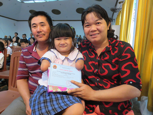 | Niềm vui của gia đình em Nguyễn Hoài Thương khi nhận học bổng Nguyễn Đức Cảnh (Ảnh: sggp.org.vn) |