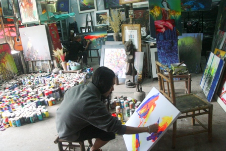 Phòng sáng tác tràn đầy tranh và các lọ màu đã sử dụng