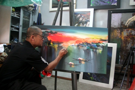 Họa sĩ Duy Hiền đang chăm chút những nét vẽ cuối cùng trong một bức tranh về đò Huế mang tên "Hừng đông"