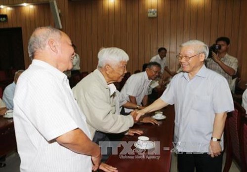 | Tổng Bí thư Nguyễn Phú Trọng gặp mặt cán bộ cấp cao nghỉ công tác, nghỉ hưu khu vực phía Nam. Ảnh: TTXVN |