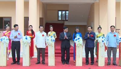 Các đại biểu cắt băng khánh thành và bàn giao đưa vào sử dụng Trung tâm tiếng Việt tỉnh Hủa Phăn.