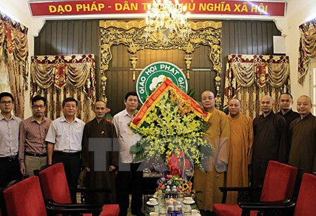 | Ông Bùi Thanh Hà, Đại diện Ban Tôn giáo Chính phủ đến tặng hoa chúc mừng Trung ương Giáo hội Phật giáo Việt Nam nhân Lễ Vu lan 2016. (Ảnh: Nguyễn Dân/TTXVN) |