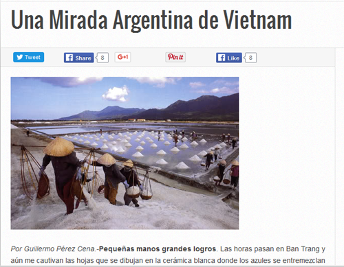 Trong bài viết dưới tiêu đề “Một góc nhìn Argentina về Việt Nam”, Giáo sư Guillermo Pérez Cena đánh giá cao những đổi thay cũng như vẻ đẹp của đất nước và con người Việt Nam. Bài viết miêu tả hình ảnh một đất nước Việt Nam sôi động, nhộn nhịp phát triển đan xen giữa những công trình cổ và những tòa nhà hiện đại, hòa mình trong dòng chảy hội nhập quốc tế, nền văn hóa đa dạng với 54 dân tộc. Đó là vẻ đẹp phong cảnh thiên nhiên của Việt Nam trải dài từ Bắc tới Nam. Các du khách quốc tế khi tới Việt Nam đều cảm nhận được tình cảm mến khách và thân thiện của dân tộc Việt Nam.