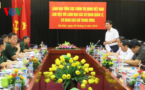 (VOV5) - Hôm nay, Tổng cục Chính trị, Quân đội nhân Việt Nam có buổi làm việc với các cơ quan quản lý, cơ quan báo chí Trung ương nhằm nâng cao chất lượng tuyên truyền về hoạt động quân sự, quốc phòng.