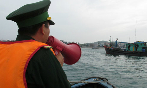 | Bộ đội biên phòng gọi ngư dân đưa thuyền vào tránh bão ở đảo Cô Tô, Quảng Ninh. Ảnh: Ninh Hằng. |