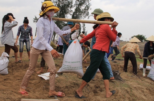 | Người dân Thanh Hóa cấp tập ngăn đê chống bão chiều 10/11. Ảnh: Lê Hoàng |