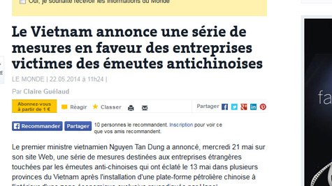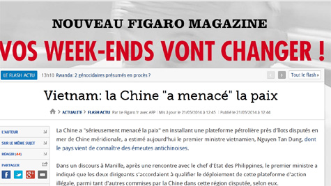 Trong khi đó tờ Le Figaro của Pháp trích dẫn lời Thủ tướng Nguyễn Tấn Dũng chỉ trích Trung Quốc đã đe dọa đến hòa bình khi đem giàn khoan vào vùng đặc quyền kinh tế của Việt Nam. Bài báo cũng thông tin đến độc giả về cuộc gặp giữa Thủ tướng Việt Nam với Tổng thống Philippines, và hai nhà lãnh đạo nhất trí đoàn kết phản đối hành động phi pháp của Trung Quốc./.