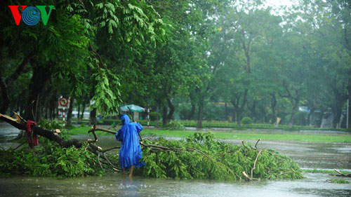 Từ đêm 14/10, gió đã mạnh dần lên ở TP Huế, mưa to đến rất to đã làm một số con đường trên TP ngập cục bộ. Sáng 15/10, mưa gió vẫn rất mạnh, đường phố vắng bóng người, cây xanh đổ khắp nơi. Nhiều người dân dầm mình trong mưa bão để mua thức ăn dự trữ trong những ngày mưa bão.