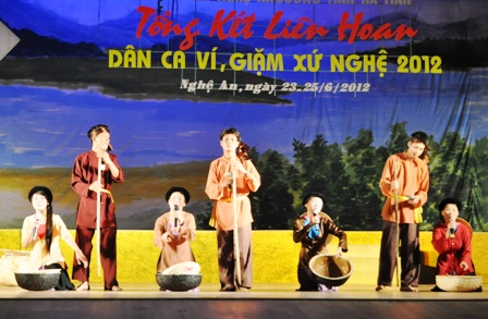 (VOV5) - Tối 25/06, tại tỉnh Nghệ An, diễn ra Lễ bế mạc Liên hoan dân ca Ví, Giặm xứ Nghệ năm 2012.Liên hoan có sự tham gia của 22 câu lạc bộ, trong đó có 17 câu lạc bộ tỉnh Nghệ An, 5 câu lạc bộ dân ca tỉnh Hà Tĩnh và 4 câu lạc bộ văn nghệ trường học của ngành Giáo dục – Đào tạo Nghệ An, với gần 700 diễn viên , nghệ nhân, nhạc công tham gia.