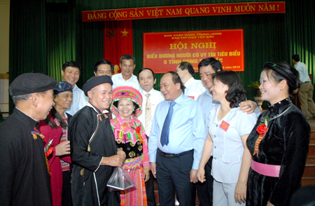 | Phó Thủ tướng Nguyễn Xuân Phúc trò chuyện cùng các đại biểu tham dự Hội nghị biểu dương người có uy tín tiêu biểu 5 tỉnh vùng núi phía Bắc (Ảnh: VGP) |