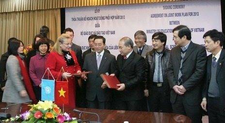 (VOV5) - Sáng 09/01, tại Hà Nội, Thứ trưởng Bộ Giáo dục và Đào tạo Nguyễn Vinh Hiển và bà Katherine Muller Marin, Trưởng Đại diện Tổ chức Giáo dục, Khoa học và Văn hóa của Liên hợp quốc tại Việt Nam (UNESCO) ký thỏa thuận về kế hoạch hoạt động phối hợp năm 2013. Thỏa thuận sẽ đề ra những hoạt động dự kiến triển khai phối hợp giữa Bộ và Tổ chức Giáo dục, Khoa học và Văn hóa của Liên hợp quốc cũng như những hoạt động mà hai bên sẽ huy động kinh phí trong năm 2013. Trong đó, ưu tiên hàng đầu của kế hoạch hoạt động phối hợp này là hỗ trợ Việt Nam trong quá trình xây dựng xã hội học tập sáng tạo, bền vững và hòa nhập.