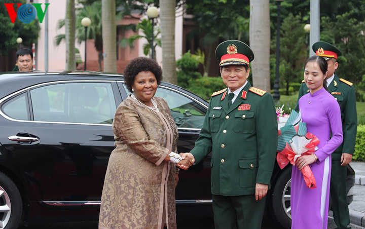 Đại tướng Ngô Xuân Lịch, Ủy viên Bộ Chính trị, Bộ trưởng Bộ Quốc phòng chủ trì Lễ đón bà Nosiviwe Nqakula, Bộ trưởng Bộ Quốc phòng và Cựu Chiến binh Nam Phi cùng các thành viên Đoàn. |