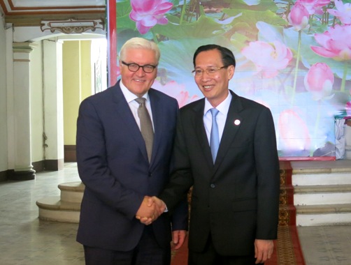 | Phó Chủ tịch Thường trực UBND TPHCM Lê Thanh Liêm (bên phải) chào mừng Bộ trưởng Ngoại giao Đức Frank-Walter Steinmeier đến thăm TPHCM. |