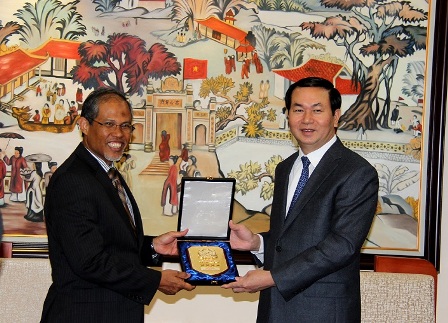 | Bộ trưởng Trần Đại Quang trao quà lưu niệm cho ngài Ma-sa-gốt Giun-ki-fli, Bộ trưởng cao cấp Nhà nước Singapore. Ảnh: Vietnam+ |
