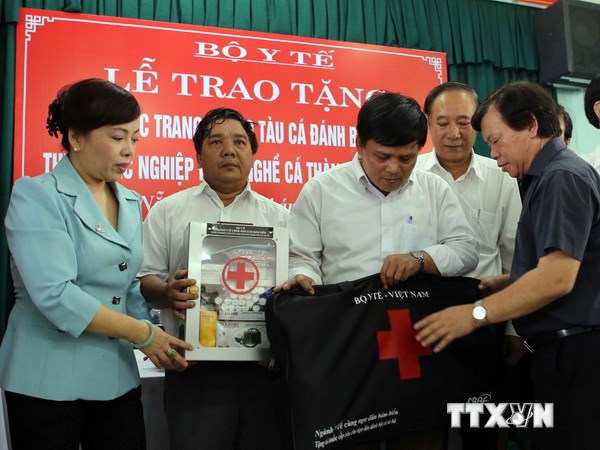 | Bộ trưởng Nguyễn Thị Kim Tiến trao tủ thuốc y tế gia đình cho các ngư dân. (Ảnh: Trần Lê Lâm/TTXVN) |