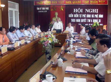 Trước đó, Ban Thường vụ Tỉnh ủy Vĩnh Phúc hôm qua cũng tổ chức hội nghị kiểm điểm tự phê bình và phê bình tập thể Ban Thường vụ theo tinh thần Nghị quyết Trung ương 4 khóa 11 về “Một số vấn đề cấp bách về xây dựng Đảng hiện nay".