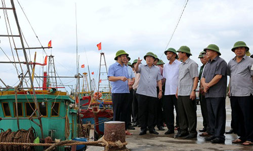 | Phó Thủ tướng đi kiểm tra nơi neo đậu tàu, thuyền của ngư dân tại Cảng cá Diêm Điền, Thái Bình (Ảnh: VGP) |