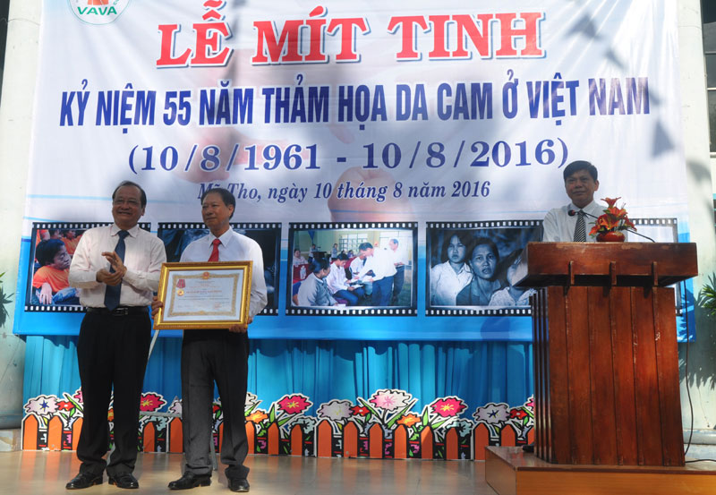 Kỷ niệm 55 năm Thảm họa da cam ở Việt Nam, tỉnh Tiền Giang tổ chức thăm hỏi, tặng 370 phần quà cho các nạn nhân bị nhiễm da cam/dioxin có hoàn cảnh đặc biệt khó khăn. Hội Nạn nhân chất độc da cam/dioxin tỉnh Tiền Giang cũng xác định hai nhiệm vụ quan trọng trong giai đoạn 2016-2020 là tiếp tục huy động tốt các nguồn lực xã hội để chăm sóc nạn nhân và hưởng ứng tích cực cuộc đấu tranh đòi công lý cho các nạn nhân. Trong 10 năm qua, các cấp Hội Nạn nhân chất độc da cam/dioxin tỉnh Tiền Giang đã vận động tặng trên 72.100 suất quà; xây dựng hơn 380 nhà tình nghĩa, nhà tình thương; trợ vốn sản xuất.. cho các gia dình nạn nhân chất độc da cam/dioxin với tổng kinh phí gần 45,7 tỷ đồng.