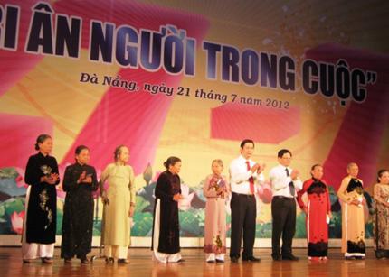 (VOV5) - Nhân kỷ niệm 65 năm Ngày Thương binh liệt sỹ (27/7), tại nhiều địa phương trên cả nước diễn ra các hoạt động đền ơn, đáp nghĩa. Ngày 21/7, Hội Liên hiệp Phụ nữ thành phố Đà Nẵng tổ chức chương trình giao lưu “Tri ân những người trong cuộc”. Chương trình “Tri ân người trong cuộc”, là dịp để cán bộ Hội Liên hiệp Phụ nữ thành phố Đà Nẵng giao lưu, chia sẻ kinh nghiệm với các nữ anh hùng lực lượng vũ trang, cán bộ Hội tham gia hai cuộc kháng chiến giải phóng dân tộc.