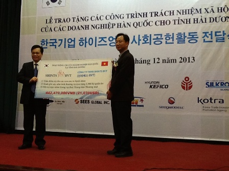 Số tiền trao tặng gần 4 tỷ 225 triệu đồng (hơn 200.000 USD) do 11 doanh nghiệp Hàn Quốc đang đầu tư tại Hải Dương, Hà Nội và Cơ quan xúc tiến Thương mại, Đầu tư Hàn Quốc (KOTRA) tài trợ. Số tiền này để giúp tỉnh Hải Dương xây nhà tình nghĩa, hỗ trợ chữa bệnh cho trẻ em và bệnh nhân nghèo, trao tặng học bổng, làm sạch môi trường, hỗ trợ các hộ kinh doanh bị thiệt hại trong vụ hỏa hoạn tại Trung tâm thương mại tỉnh Hải Dương. Dịp này, phía Hàn Quốc cũng tặng tỉnh Hải Dương 300 bộ truyện thiếu nhi Việt Nam - Hàn Quốc.