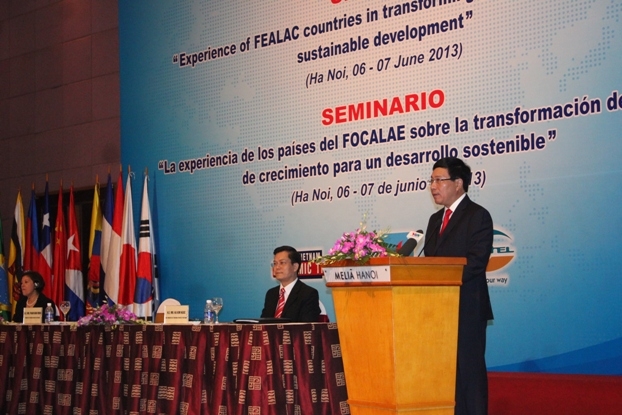 Phát biểu tại hội thảo, Bộ trưởng Ngoại giao Việt Nam Phạm Bình Minh nêu rõ Việt Nam rất quan tâm tới vấn đề chuyển đổi mô hình tăng trưởng, trong đó xác định 3 nội dung tái cơ cấu kinh tế chủ chốt là tái cơ cấu đầu tư công, tái cơ cấu doanh nghiệp Nhà nước, tái cơ cấu tài chính – ngân hàng. Bộ trưởng Phạm Bình Minh cũng cho rằng bối cảnh nên kinh tế thế giới đang có những chuyển đổi mạnh mẽ sau cuộc khủng hoảng chính là cơ hội để các nước Đông Á và Mỹ Latin tham gia hiệu quả vào phân công lao động toàn cầu:“Một số nước thành viên FEALAC trong thời gian qua đã rất chú trọng thực hiện các biện pháp cải tổ cơ cấu, điều chỉnh chính sách phát triển nhằm hướng tới sự phát triển bền vững và hội nhập quốc tế hiệu quả. Kết quả đạt được đến nay tương đối tích cực. Với những điểm tương đồng về kinh tế - xã hội, có thể khẳng định tiềm năng hợp tác giữa các nước FEALAC là rất lớn. Nếu tận dụng tốt tiềm năng này, các nước chúng ta có thể tiếp thu những kinh nghiệm bổ ích cũng như tăg cường khả năng huy động các nguồn lực phục vụ cho tiến trình chuyển đổi mô hình tăng trưởng.”
