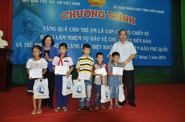 (VOV5) - Ngày 27/7, Quỹ Bảo trợ trẻ em Việt Nam và Ủy ban nhân dân tỉnh Kiên Giang tổ chức buổi tặng quà trẻ em là con cán bộ, chiến sĩ đang làm nhiệm vụ bảo vệ chủ quyền biển, đảo và trẻ em có hoàn cảnh đặc biệt khó khăn tại huyện đảo Phú Quốc (Kiên Giang). Ông Nguyễn Thiện Nhân, Ủy viên Bộ Chính trị, Chủ tịch Ủy ban Trung ương Mặt trận Tổ quốc Việt Nam, tham dự chương trình.