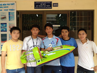 | Nhóm sinh viên chế tạo mô hình tàu đệm khí - Ảnh: Lê Thanh |