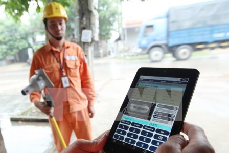 | Công nhân Công ty Điện lực Sóc Sơn thuộc Tổng Công ty Điện lực Hà Nội ghi chỉ số côngtơ khách hàng trên địa bàn bằng thiết bị mới. (Ảnh: Ngọc Hà/TTXVN) |