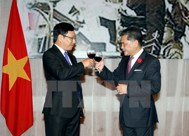| Phó Thủ tướng, Bộ trưởng Bộ Ngoại giao Phạm Bình Minh chúc mừng Đại sứ Đặc mệnh toàn quyền Malaysia tại Việt Nam Dato Azmil Bin Mohamed Zabidi. (Ảnh: Phạm Kiên/TTXVN) |