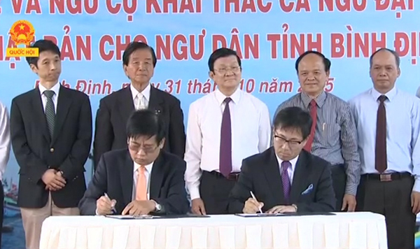 Tại buổi lễ, Chủ tịch nước Trương Tấn Sang cùng lãnh đạo Bộ Nông nghiệp và Phát triển Nông thôn, tỉnh Bình Định cùng các ngư dân đã chứng kiến lễ ký kết biên bản giao nhận ngư cụ của Nhật Bản và kinh phí nâng cấp hầm bảo quản của Ủy ban nhân dân tỉnh Bình Định cho ngư dân; Bản ghi nhớ hợp tác giữa đại học Nhật Bản Kagoshima (Nhật Bản) và tỉnh Bình Định trong nghiên cứu tiềm năng thủy sản. Chủ tịch nước Trương Tấn Sang cũng tặng quà cho các ngư dân tham gia chương trình, có nhiều đóng góp trong quá trình vươn khơi bám biển, bảo vệ chủ quyền Tổ quốc.