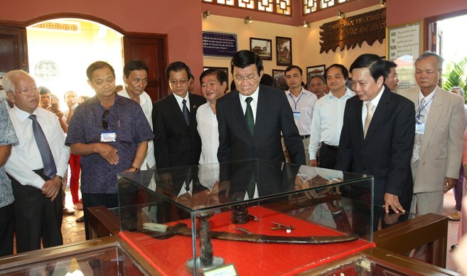 | Chủ tịch nước Trương Tấn Sang thăm nhà trưng bày hiện vật về Anh hùng Dân tộc Trương Định tại xã Gia Thuận, huyện Gò Công Đông. (Ảnh: Thanh Vũ/TTXVN) |