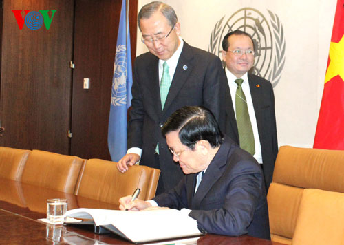 Tại cuộc gặp với Tổng Thư ký LHQ Ban Ki-moon, Ngài Tổng thư ký đã thông báo với Chủ tịch nước Trương Tấn Sang những ưu tiên phát triển của LHQ; đánh giá cao những thành tựu của Việt Nam trong phát triển kinh tế - xã hội, giữ vững ổn định chính trị, đóng góp tích cực vào ổn định và phát triển của khu vực và thế giới.