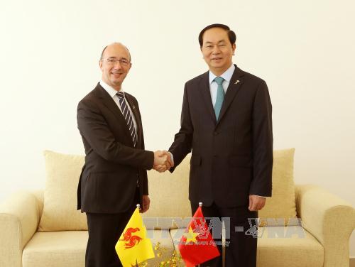 Tại cuộc gặp với Bộ trưởng, Thủ hiến vùng Wallonie - Bruselles của Bỉ Rudy Demotte, Chủ tịch nước Trần Đại Quang mong muốn hai bên tiếp tục phối hợp chặt chẽ để thực hiện các dự án trong khuôn khổ Pháp ngữ trong thời gian tới. Tại cuộc gặp với Trưởng đoàn Ai Cập Ibrahim, Chủ tịch nước Trần Đại Quang đề nghị Ai Cập hỗ trợ Việt Nam thành lập Trung tâm chứng nhận Halal Việt Nam để cấp chứng chỉ tiêu chuẩn cho hàng hóa Việt Nam xuất khẩu vào các thị trường Hồi giáo.
